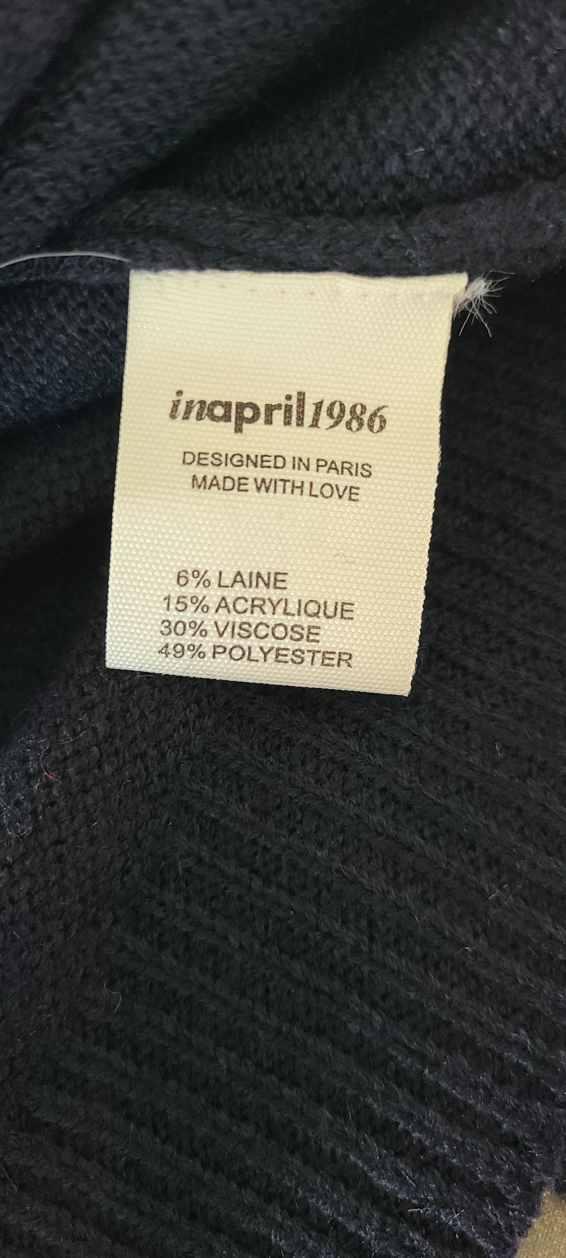 Composition : 49% polyester, 30% viscose, 15% acrylique, 6% laine