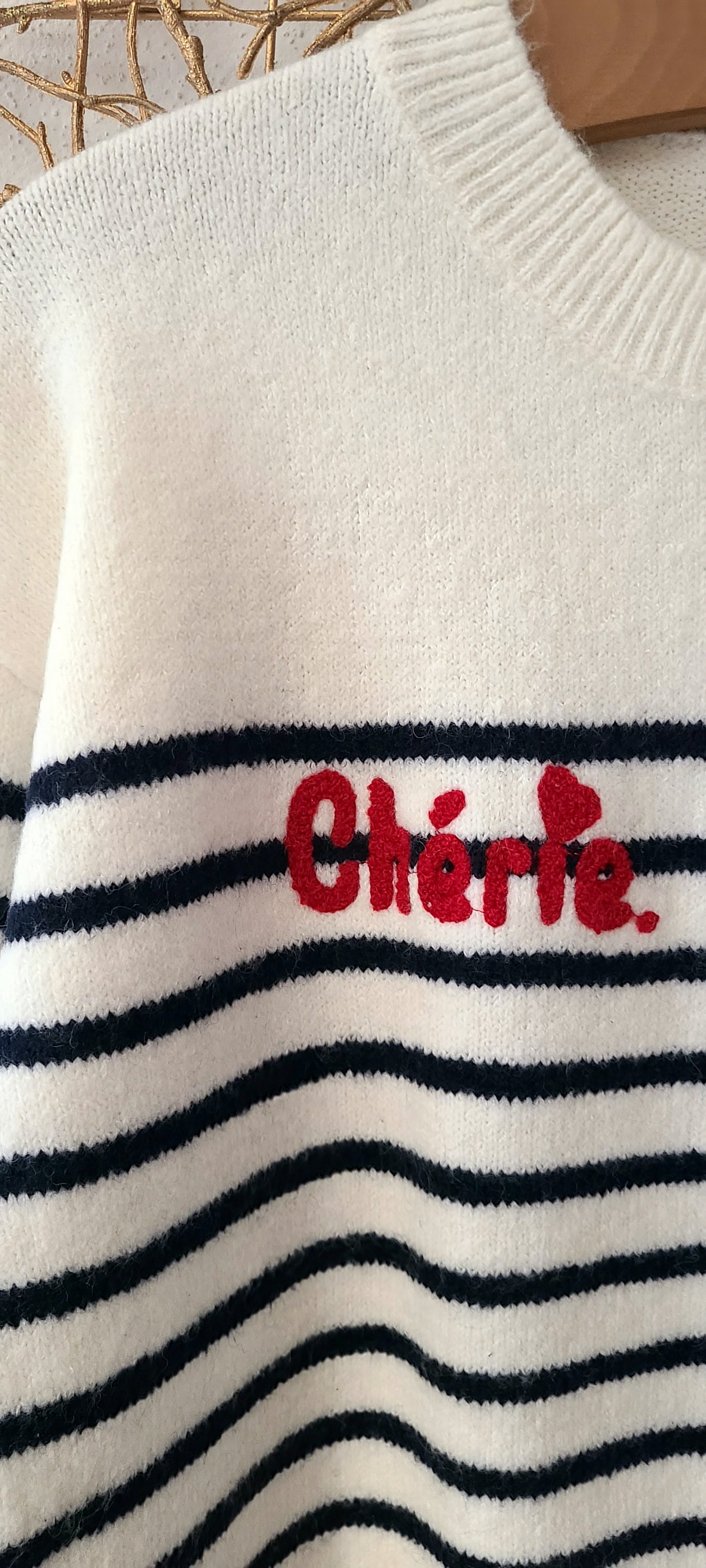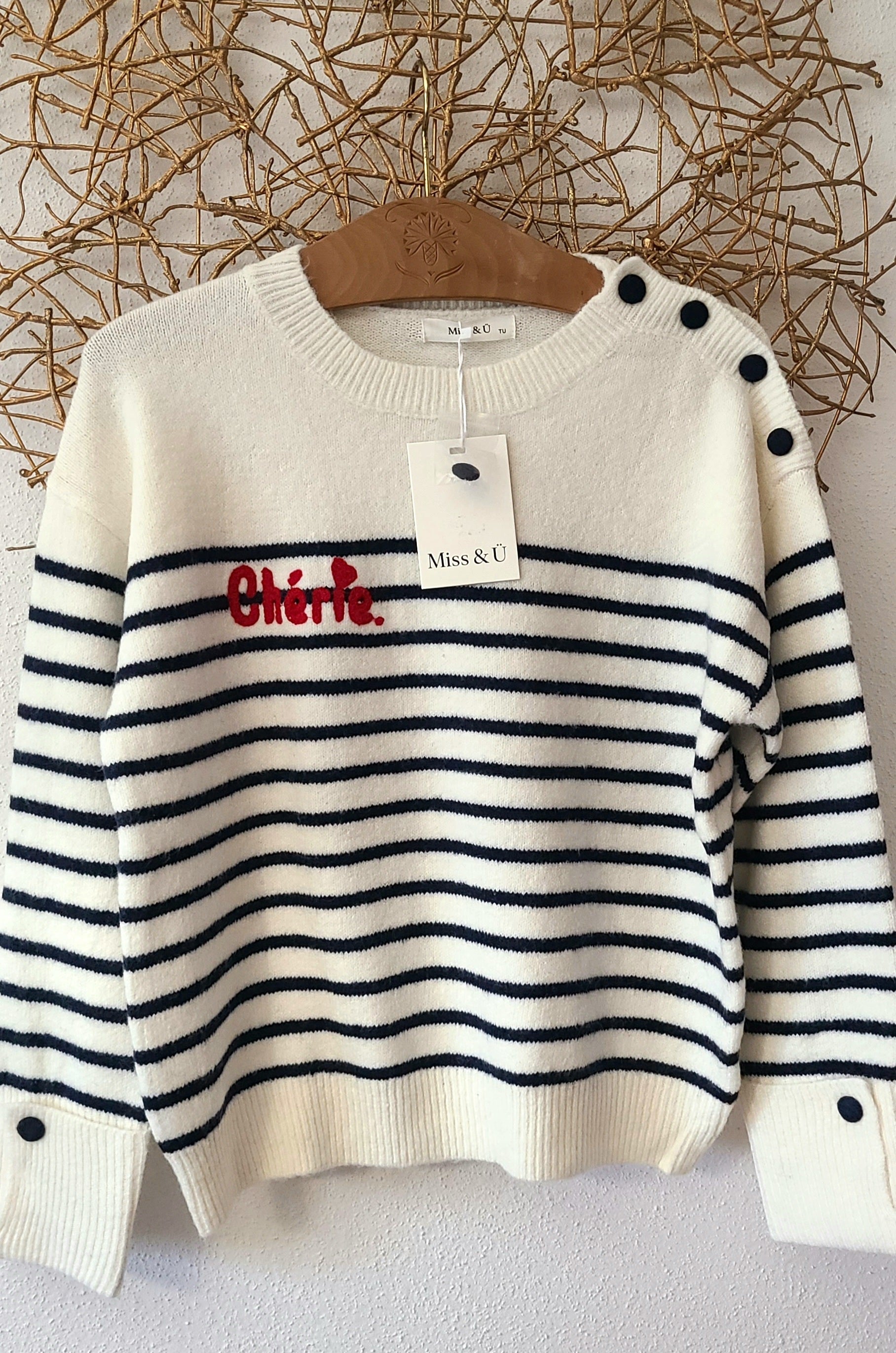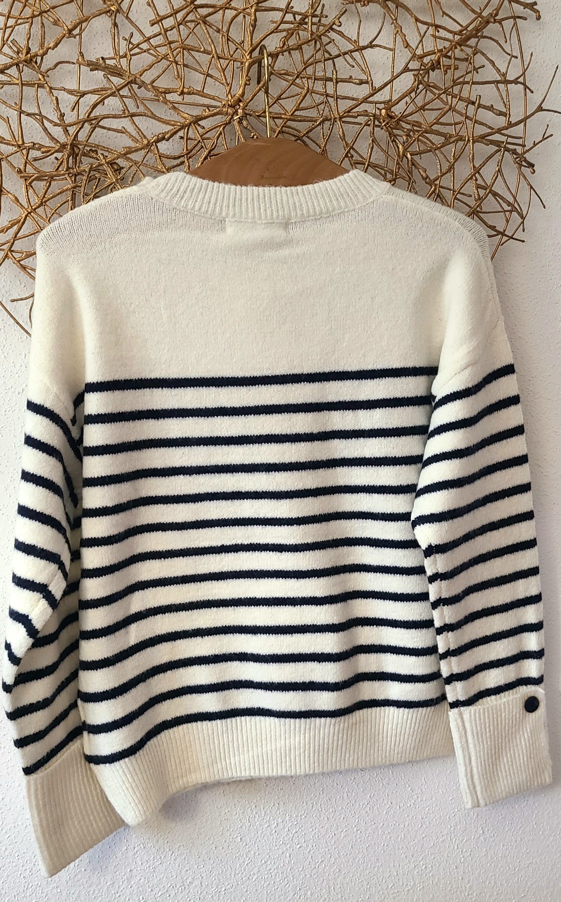 Pull marinière à rayures classiques, revisité dans une matière douce et chaude. Coupe confortable et légèrement oversize, parfaite pour les tailles 36 à 42. Un essentiel du dressing, idéal pour un look casual chic ou bord de mer.